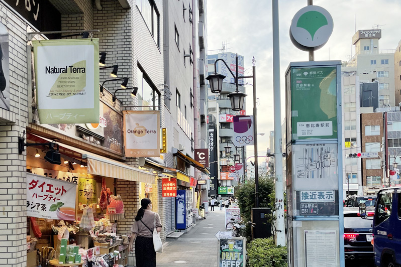 ②東口(ロータリー)の下り坂を直進しますと、『みずほ銀行(恵比寿支店)』がありますので、そのまま直進して「バス通り」を道なりに進んでください。