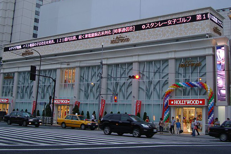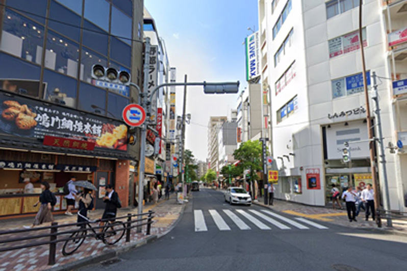②改札を出まして、大通り横断歩道を「HOLLY WOOD(ハリウッド)」パチンコ店側に渡り左手にお進みください。